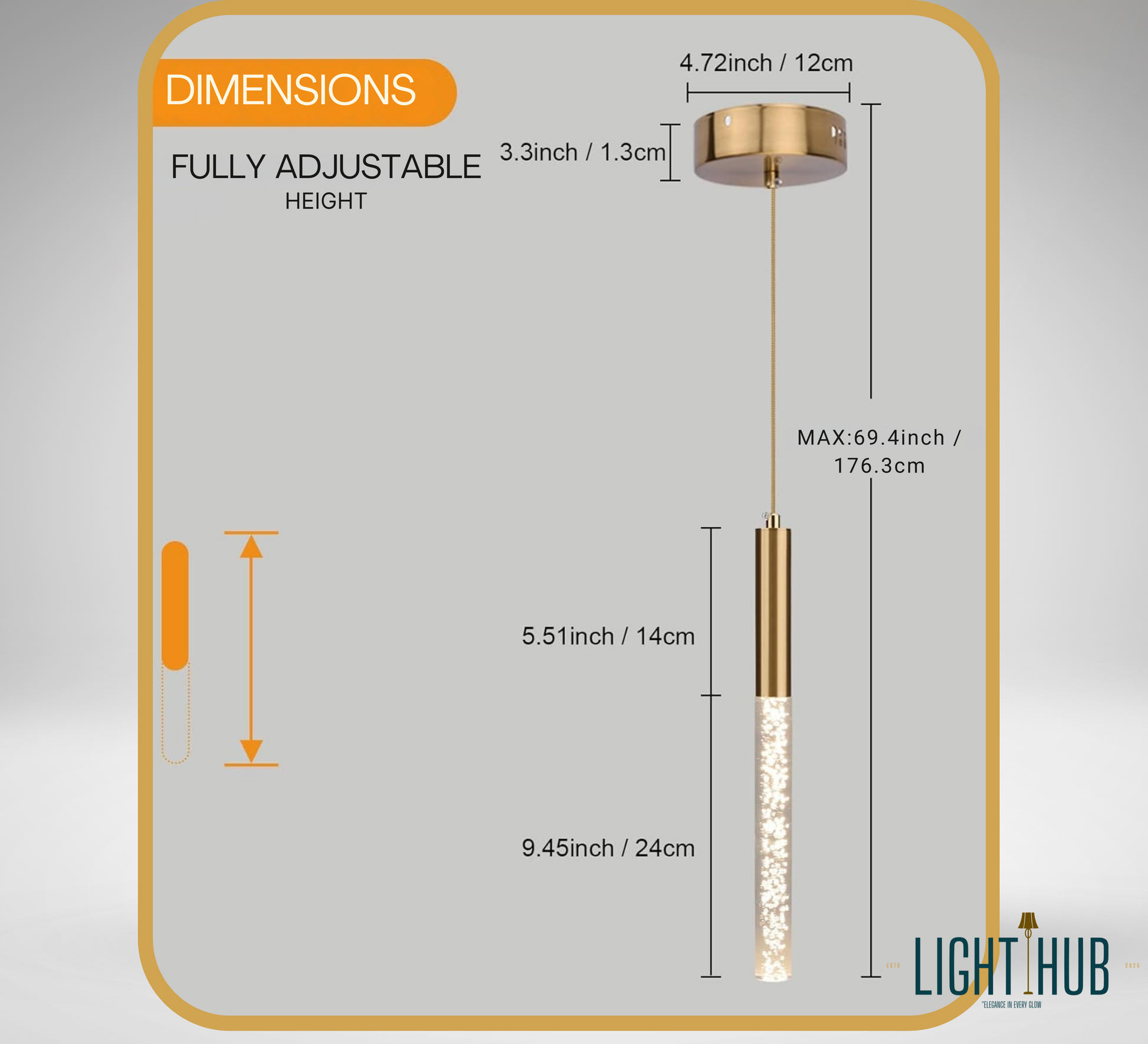 Ajoutez une touche de modernite et de luxe a votre espace avec GLINT une elegante suspension en cristal signee Light Hub. Son design allonge et sa finition doree apportent une ambiance luxueuse et contemporaine ideale pour les interieurs sophistiques. Le cylindre de cristal integre des puces LED de haute qualite diffusant une lumiere chaleureuse et scintillante qui sublime chaque detail de votre decor.