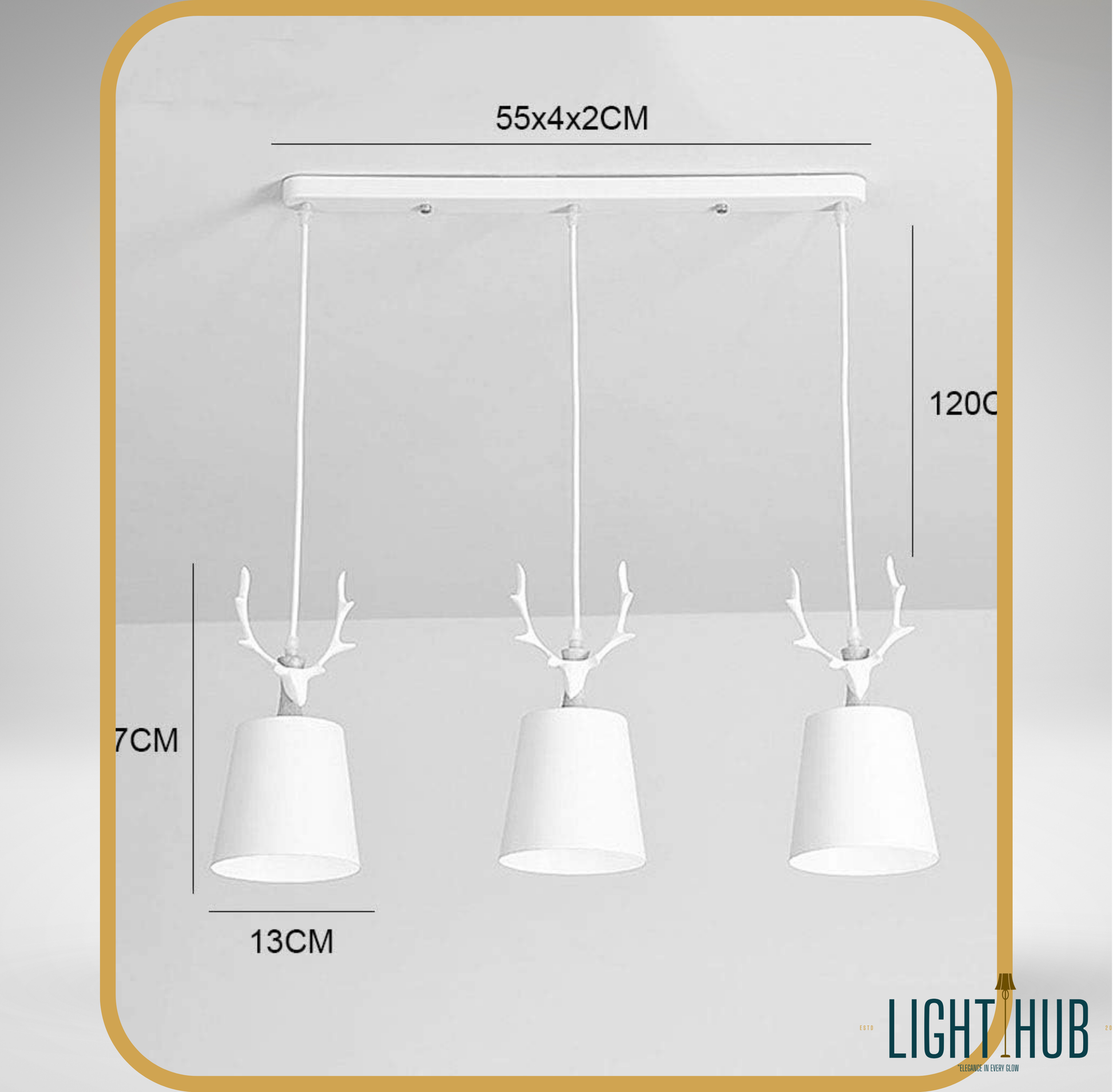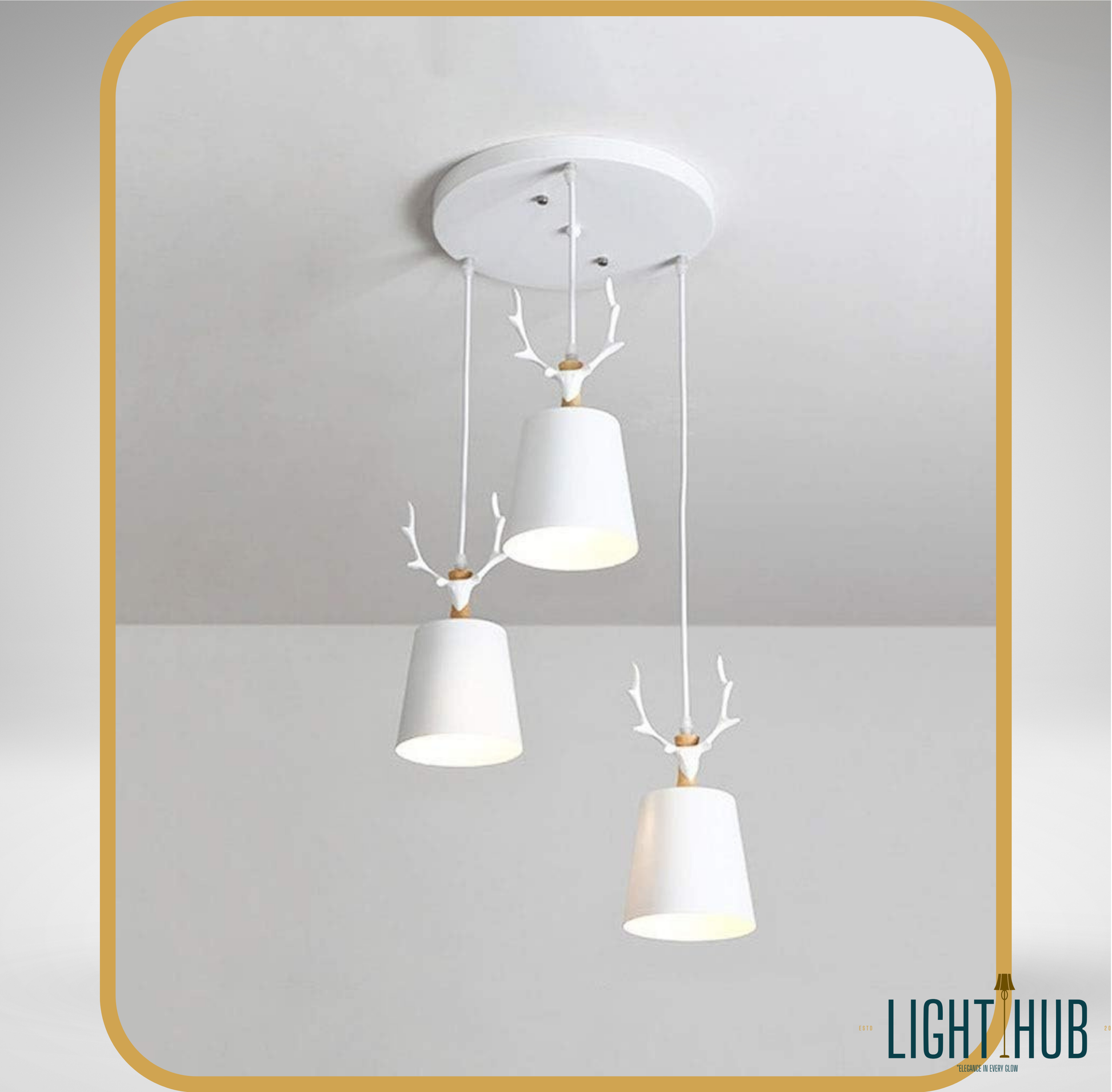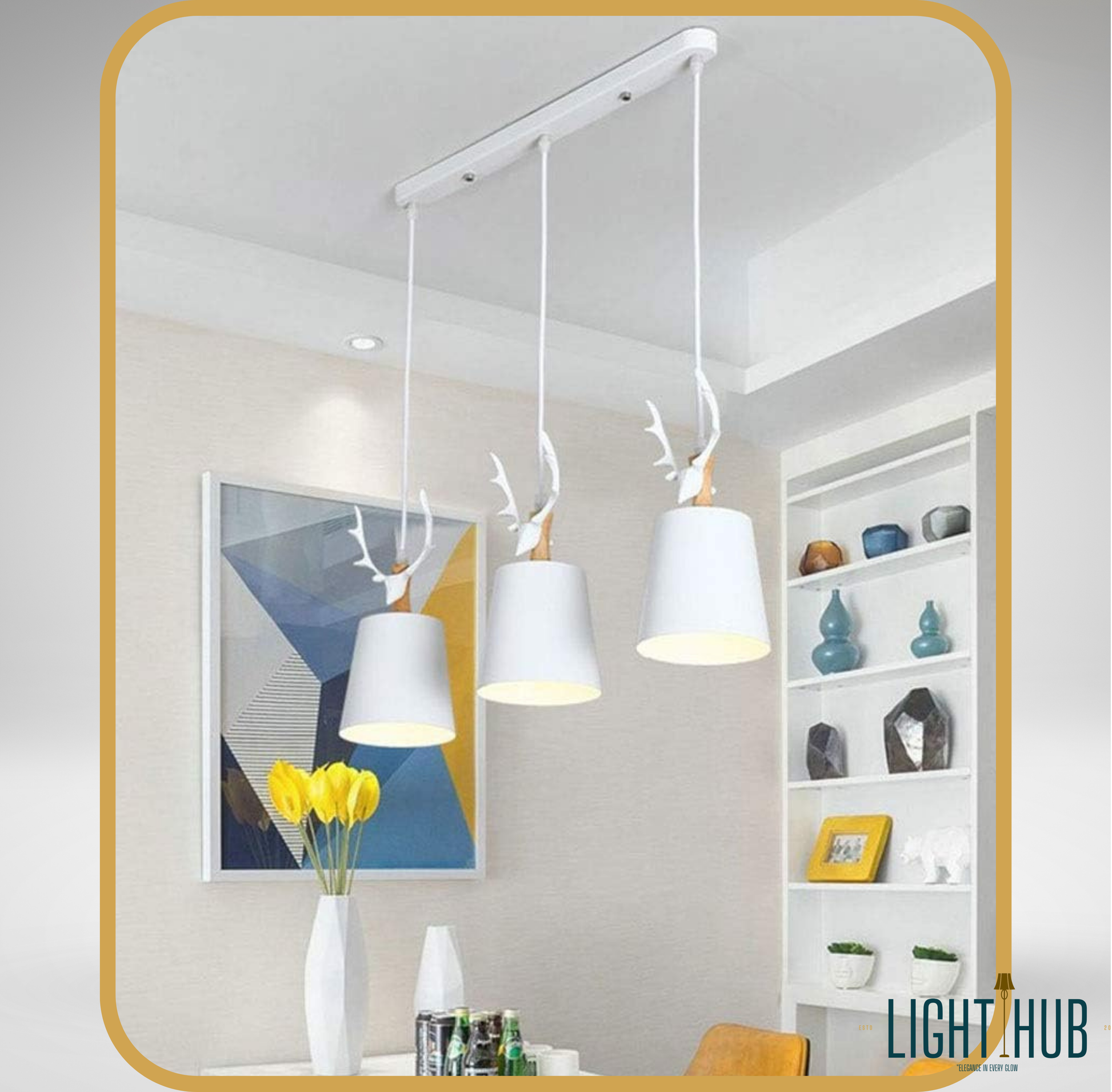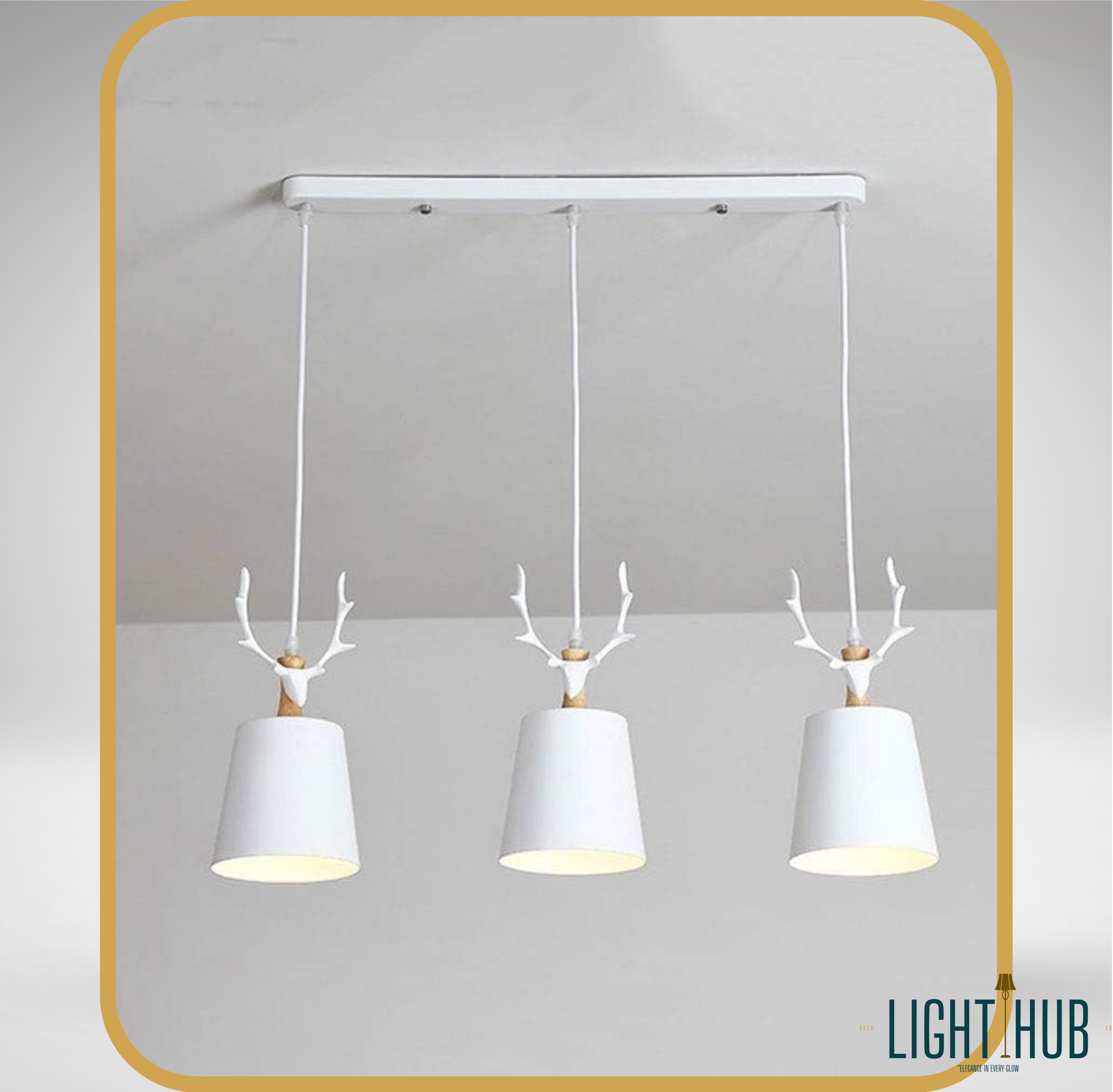 Transformez votre interieur en un havre d elegance moderne avec la suspension GLENICH. Concue avec une approche unique ce luminaire a trois lumieres allie la grace de la nature au design contemporain. Chaque tete de lampe est ornee de bois de cerf stylises en couleur blanche surmontant un abat jour conique assorti. Cet ensemble cree une ambiance chic et distinctive parfaite pour de nombreux espaces.
