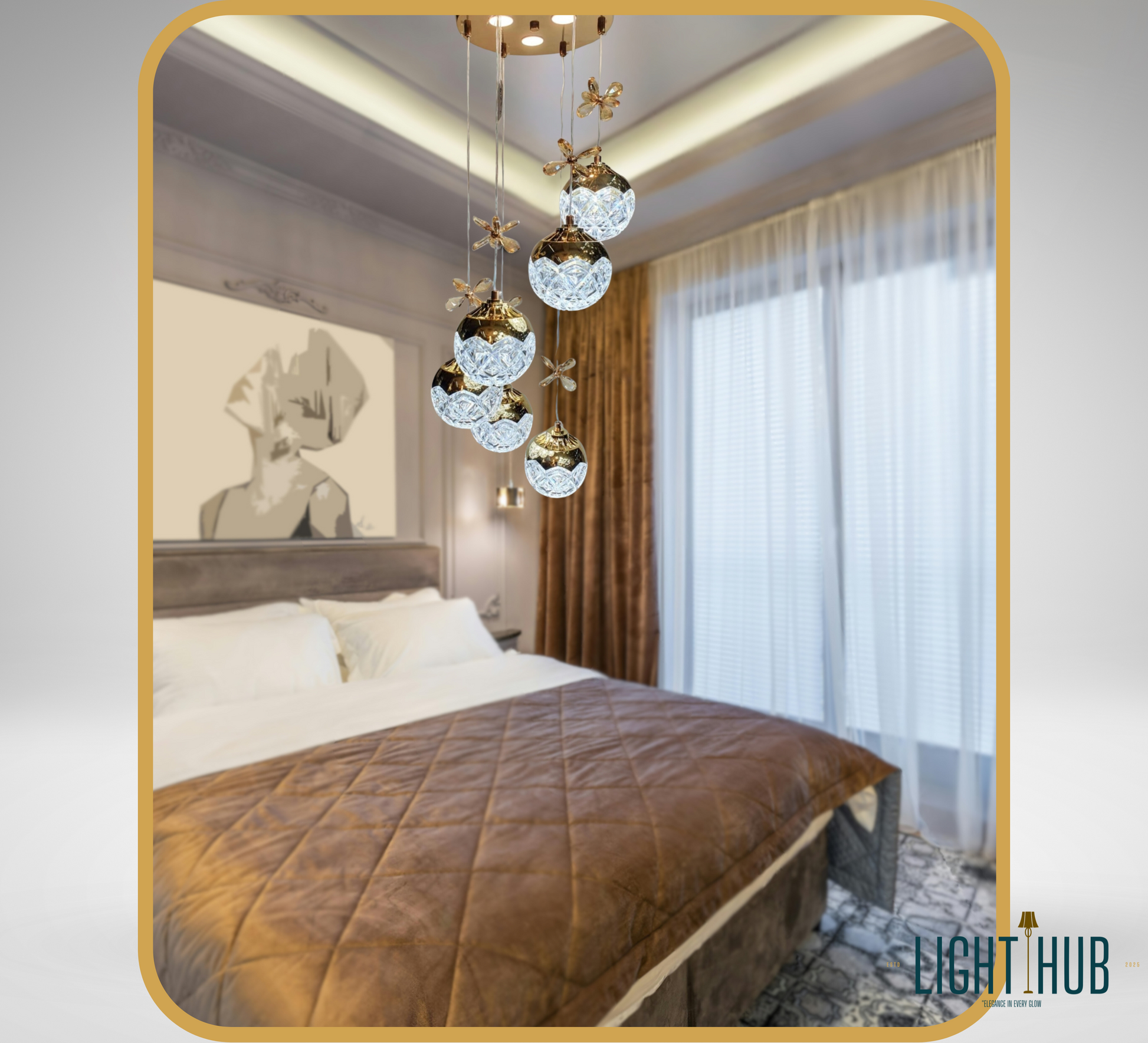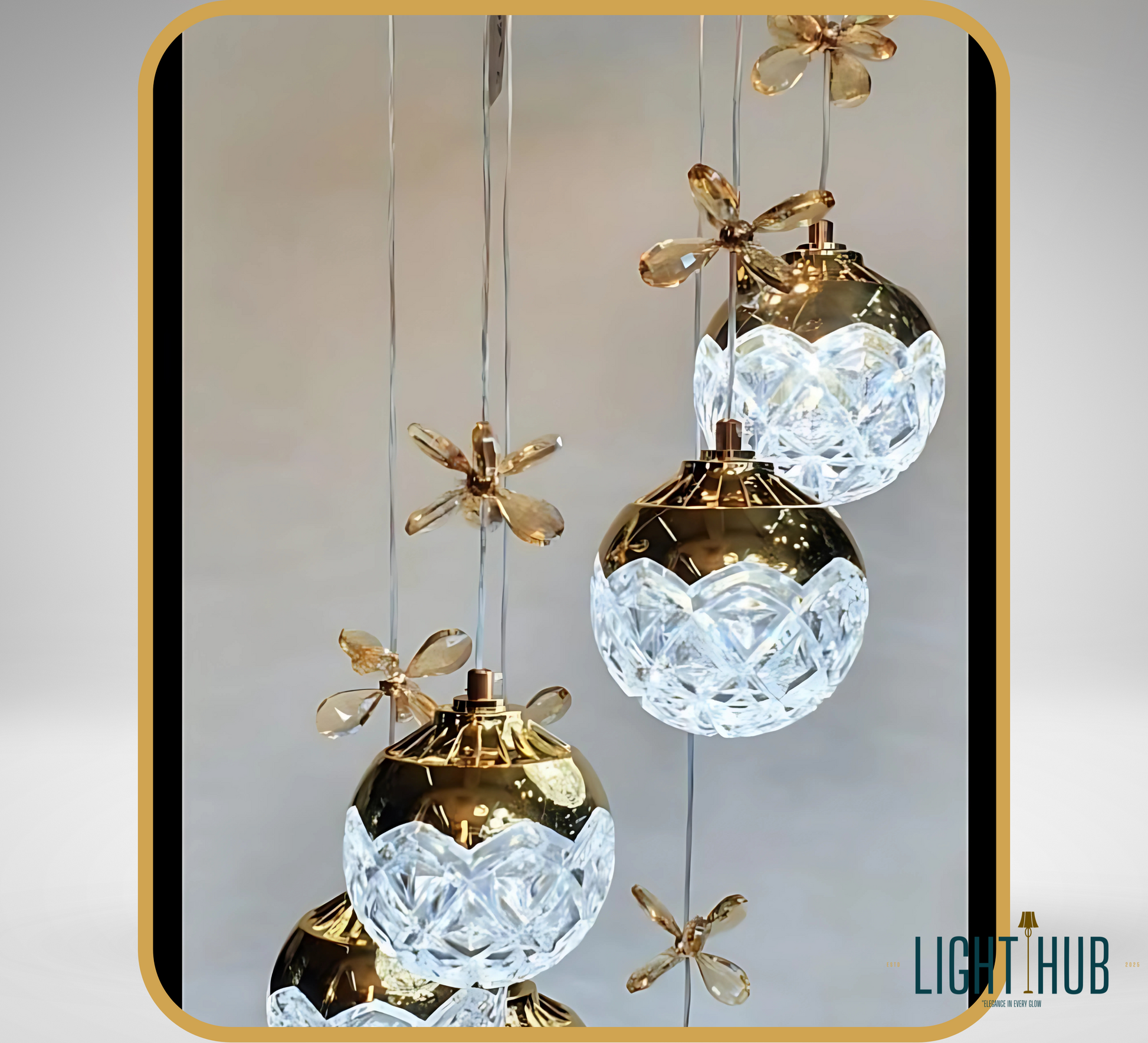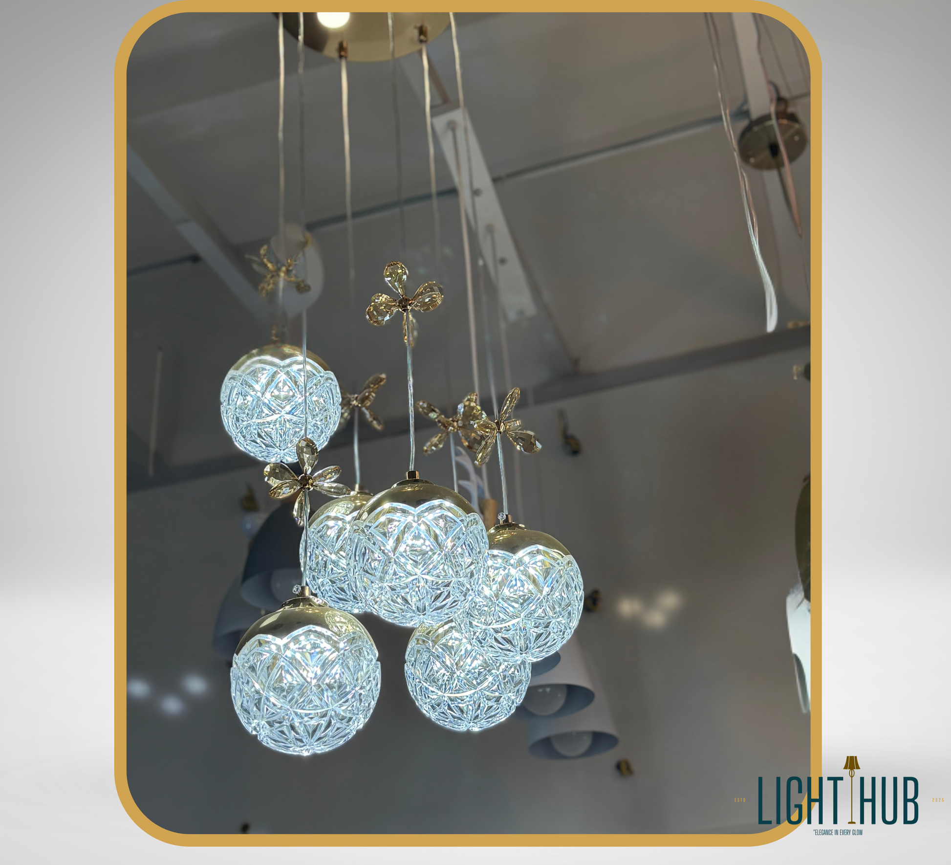 Le lustre suspendu GEROUNDS est une piece d eclairage elegante et luxueuse concue pour sublimer votre interieur. Ce luminaire se distingue par ses six globes spheriques en verre facette semblables a du cristal qui reflechissent la lumiere avec eclat. Chaque globe est rehausse par des elements dores et des accents decoratifs en forme de fleur ajoutant une touche de raffinement. GEROUNDS cree une ambiance scintillante et sophistiquee transformant immediatement les salons les salles a manger les chambres et les grandes entrees en espaces de grand style. C est un choix ideal pour ceux qui recherchent un luminaire a la fois fonctionnel et fortement decoratif capable d apporter un point focal lumineux et glamour a leur decor.
