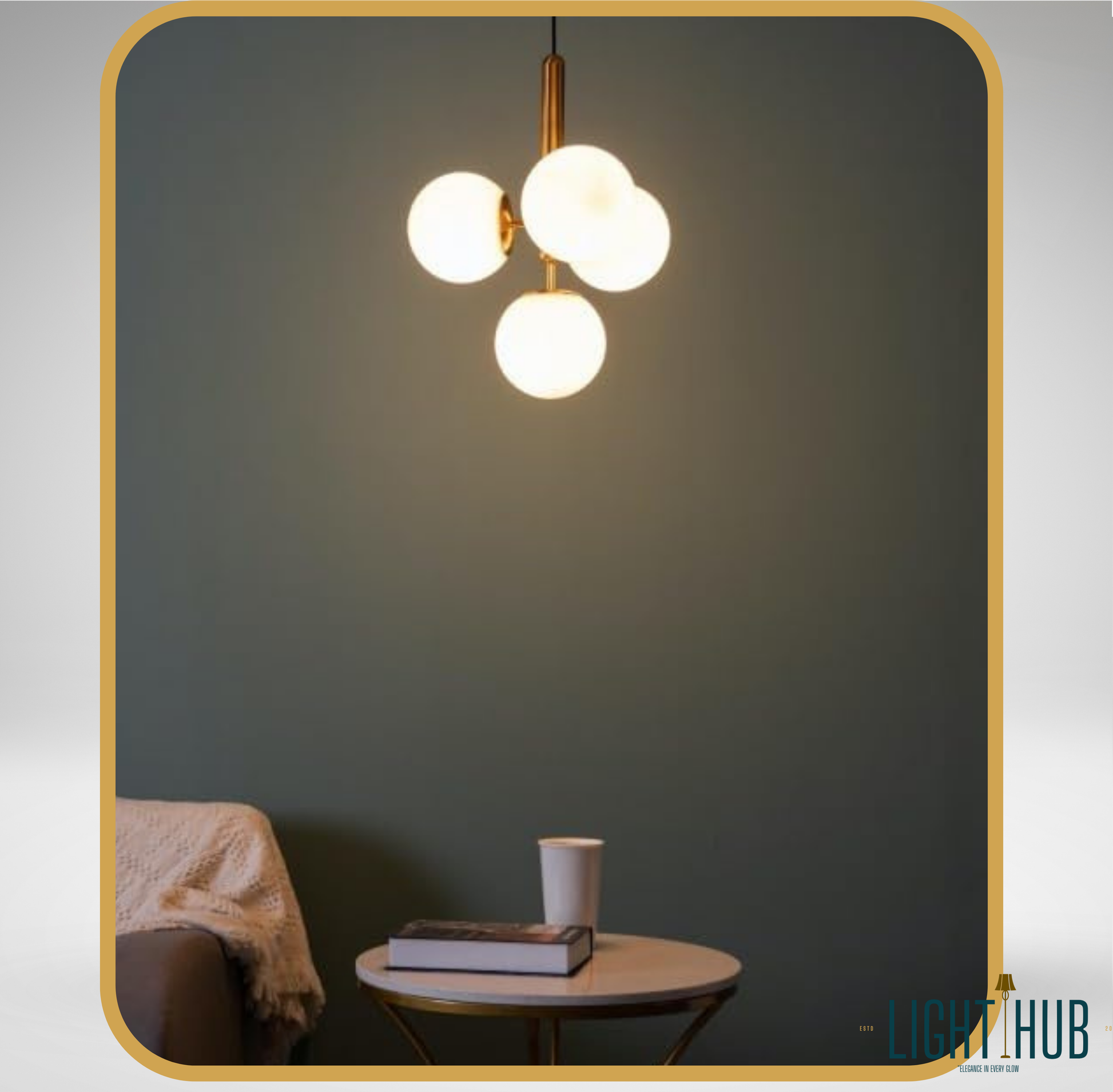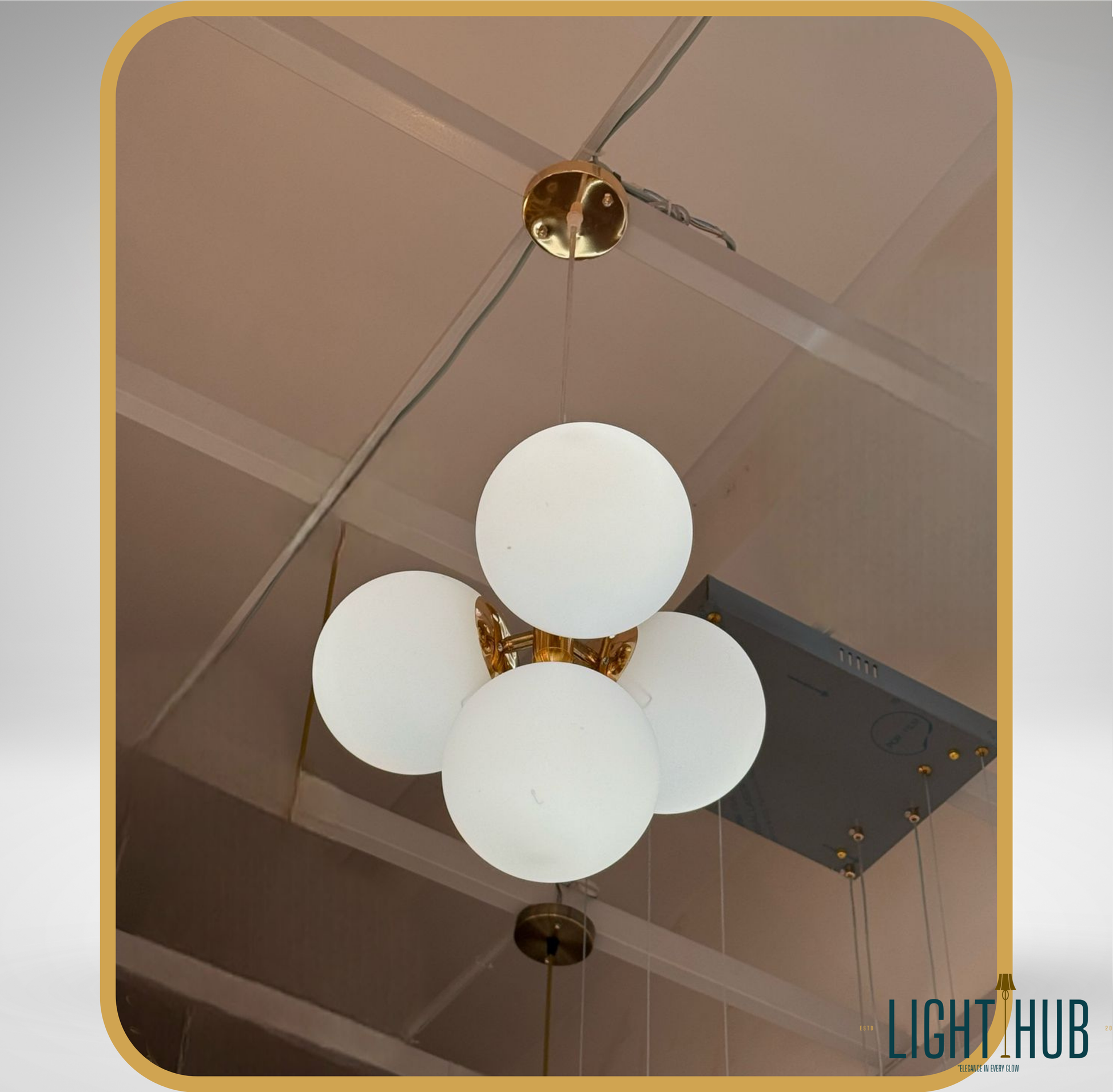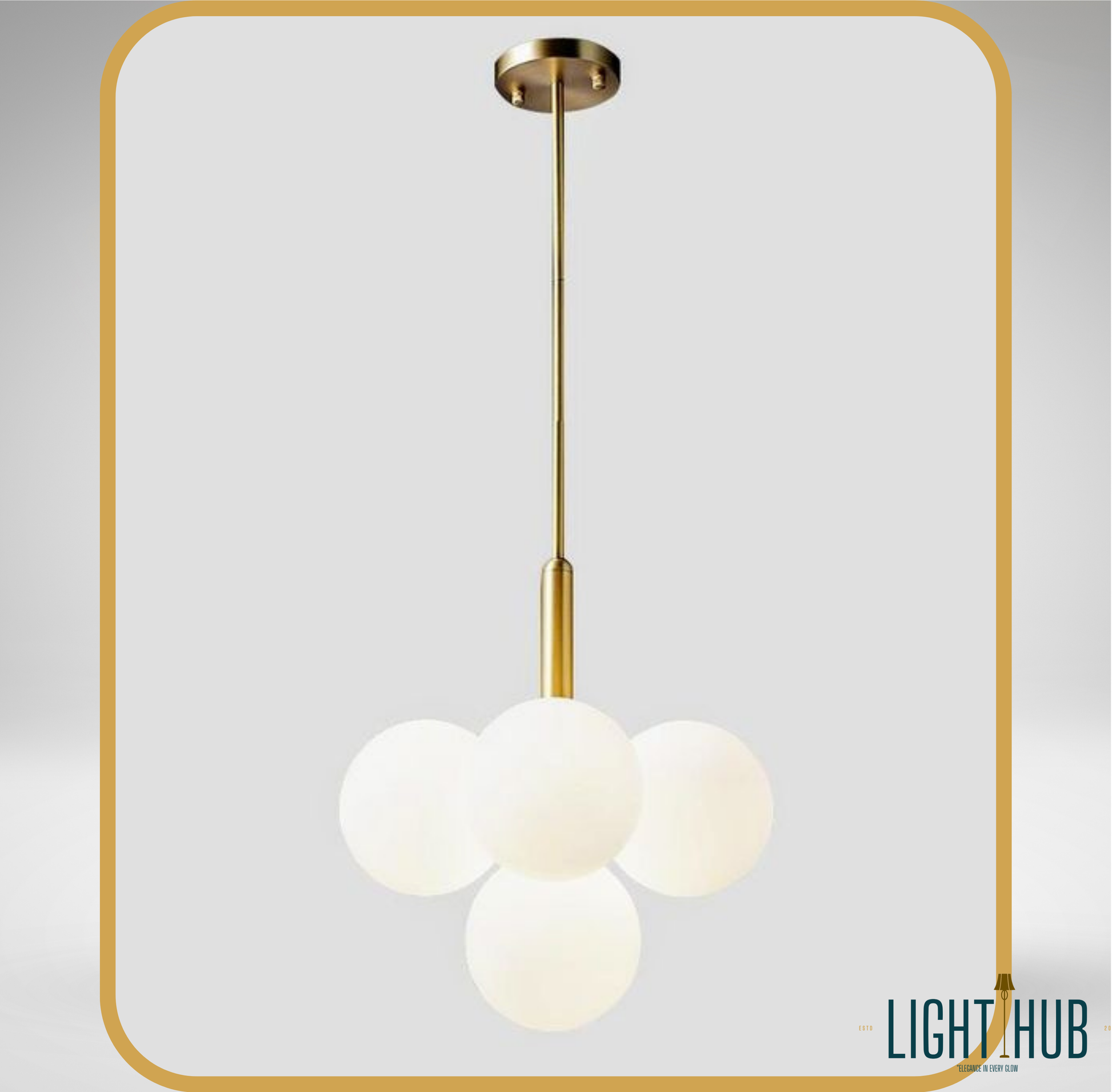 Apportez une touche d'élégance à votre intérieur avec cette suspension contemporaine composée de quatre globes en verre dépoli, harmonieusement regroupés. Soutenus par une tige en laiton doré, les globes diffusent une lumière chaude et accueillante, idéale pour créer une ambiance cosy dans un salon, une chambre ou un coin lecture. Son design minimaliste s'intègre parfaitement aux décors modernes, scandinaves ou inspirés du style mid-century. À la fois esthétique et fonctionnelle, cette suspension devient une véritable pièce maîtresse de votre décoration.